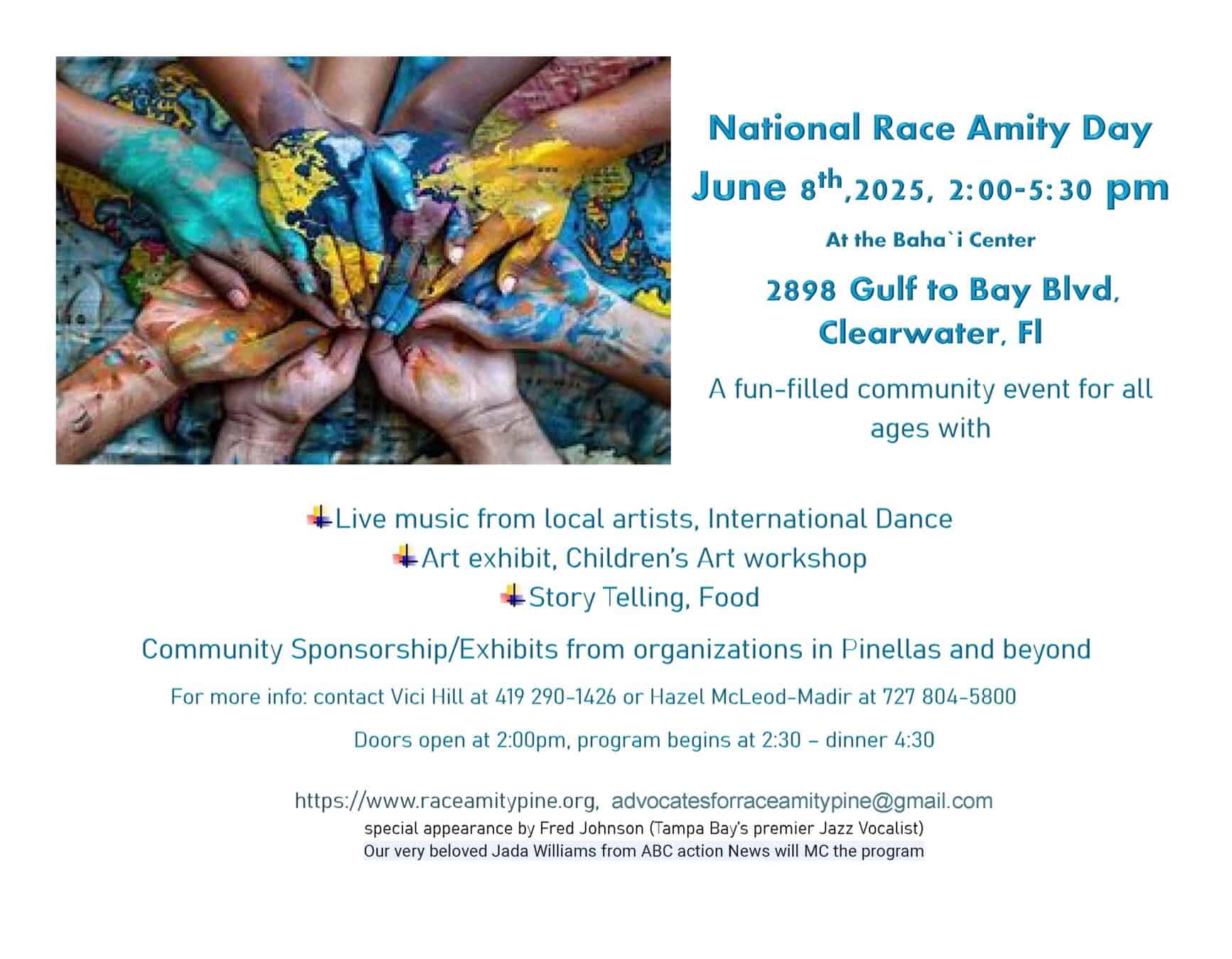 Race Amity Day Proclamation - Pinellas County, FL A fun-filled community event for all ages with Live music from local artists, International Dance Art exhibit, Children’s Art workshop Story Telling, Food Community Sponsorship/Exhibits from organizations in Pinellas and beyond For more info: contact Vici Hill at 419 290-1426 or Hazel McLeod-Madir at 727 804-5800 Doors […] |